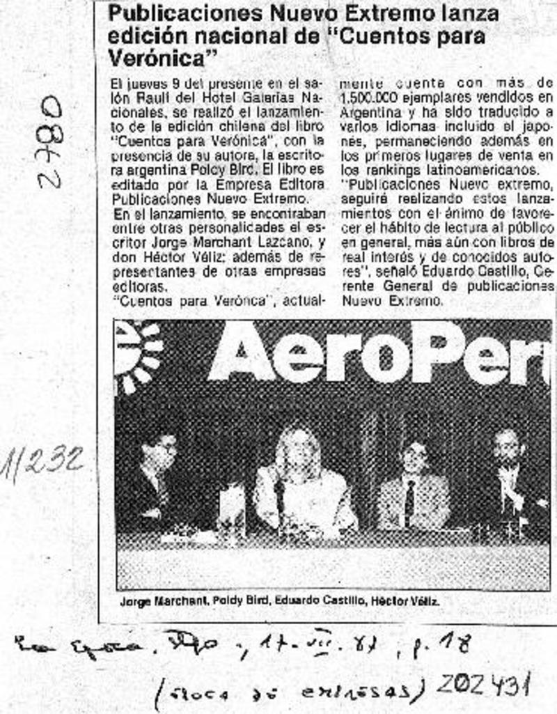 Vera Land lanzó su novela primogénita [entrevista]. [artículo] :