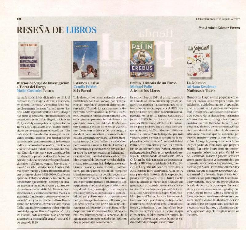 Autoras argentinas - Autores austríacos - Gusinde, Martin - Fabbri, Camila - Estamos a salvo - Diarios de viaje de investigación a Tierra del Fuego - Keselman, Adriana - La solución - Palin, Michael - Erebus, historia de un barco