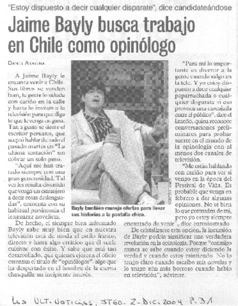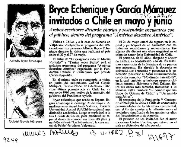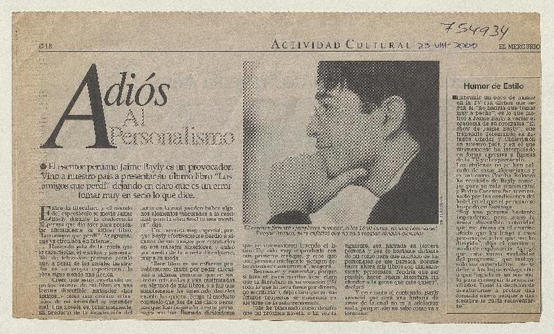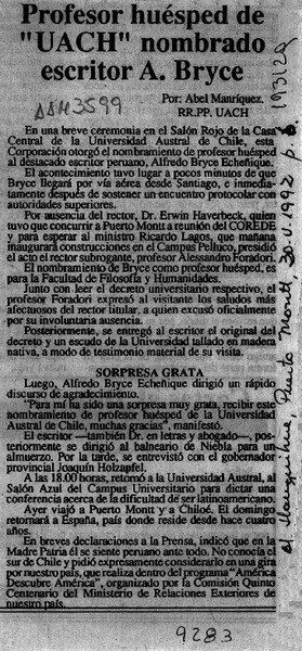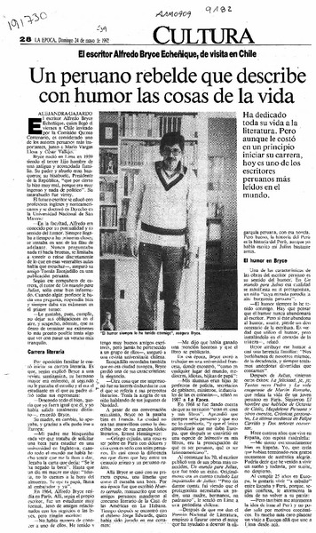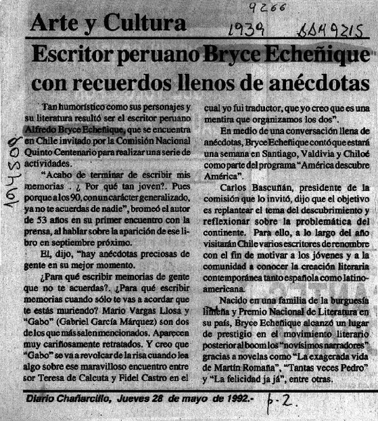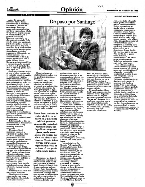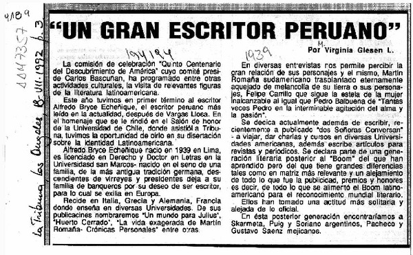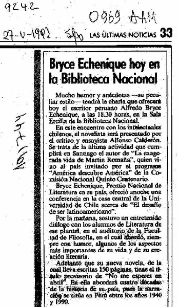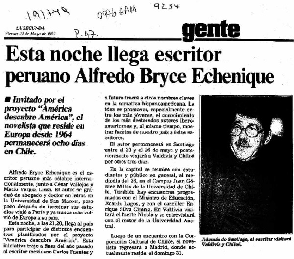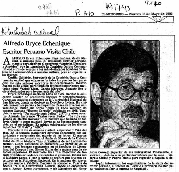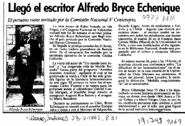 Alfredo Bryce Echenique, escritor peruano visita Chile [artículo].