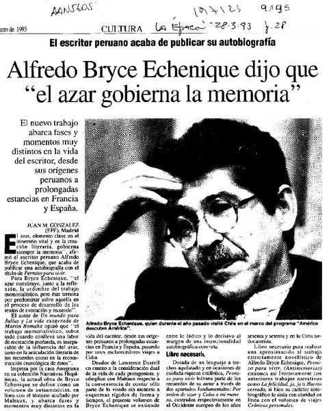 Alfredo Bryce Echenique dijo que "el azar gobierna la memoria" [artículo] Juan M. González.