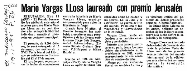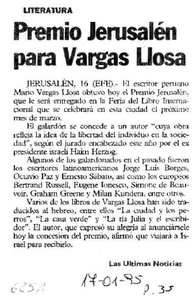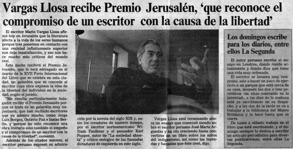 Vargas Llosa recibe Premio Jerusalén, "que reconoce el compromiso de un escritor con la causa de la libertad" [artículo].
