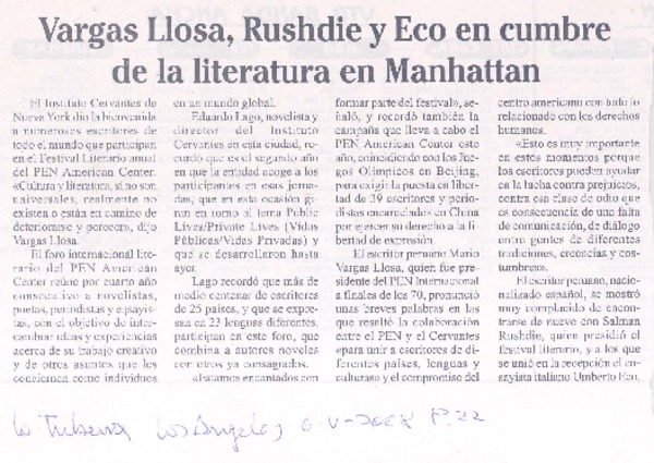 Vargas Llosa, Rushdie y Eco en cumbre de la literatura en Mnhattan [artículo].