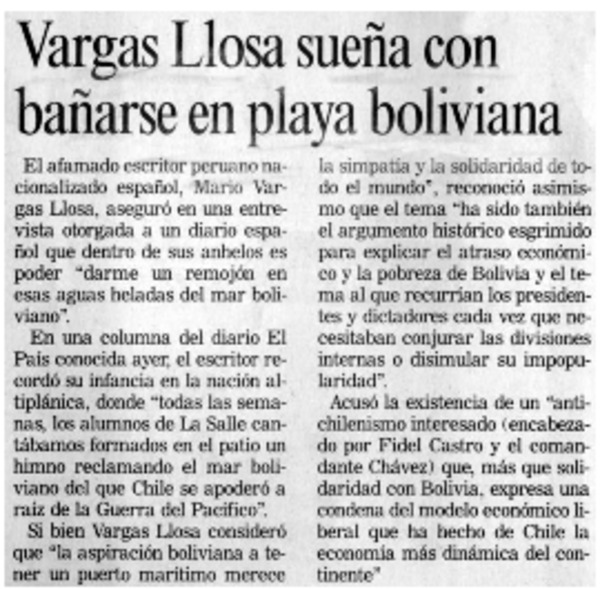 Vargas Llosa sueña con bañarse en playa boliviana [artículo]