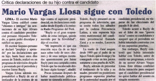 Vargas Llosa se sumó a críticas peruanas al quinto gabinete de Toledo [artículo].
