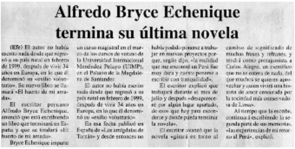 Alfredo Bryce Echeñique termina su última novela [artículo]