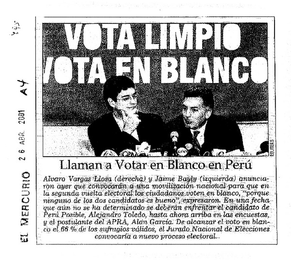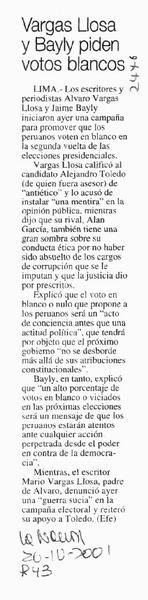 Vargas Llosa y Bayly piden votos blancos. [artículo]