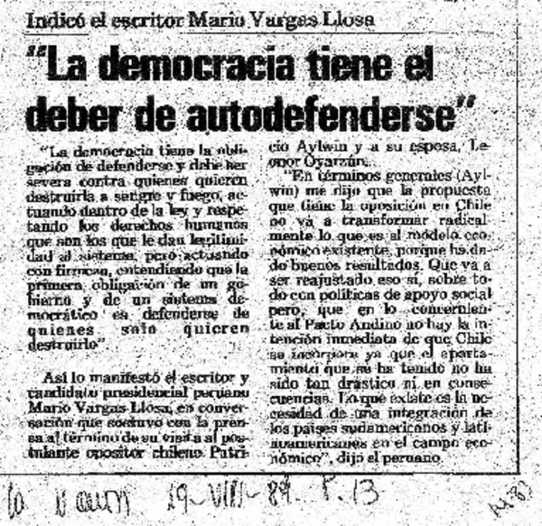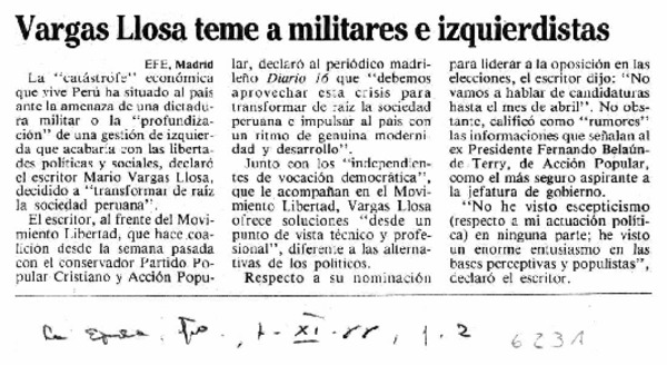 Vargas Llosa teme a militares e izquierdistas. [artículo]