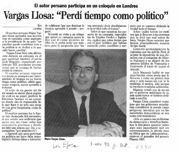 Vargas Llosa, "perdí tiempo como político". [artículo]