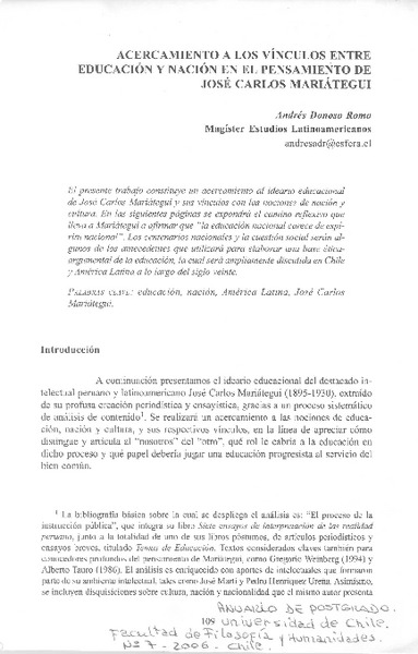 Acercamiento a los vículos entre educación y Nación en el pensamiento de José Carlos Mariátegui [artículo]Andrés Donoso Romo.