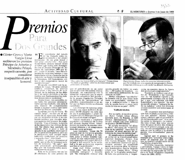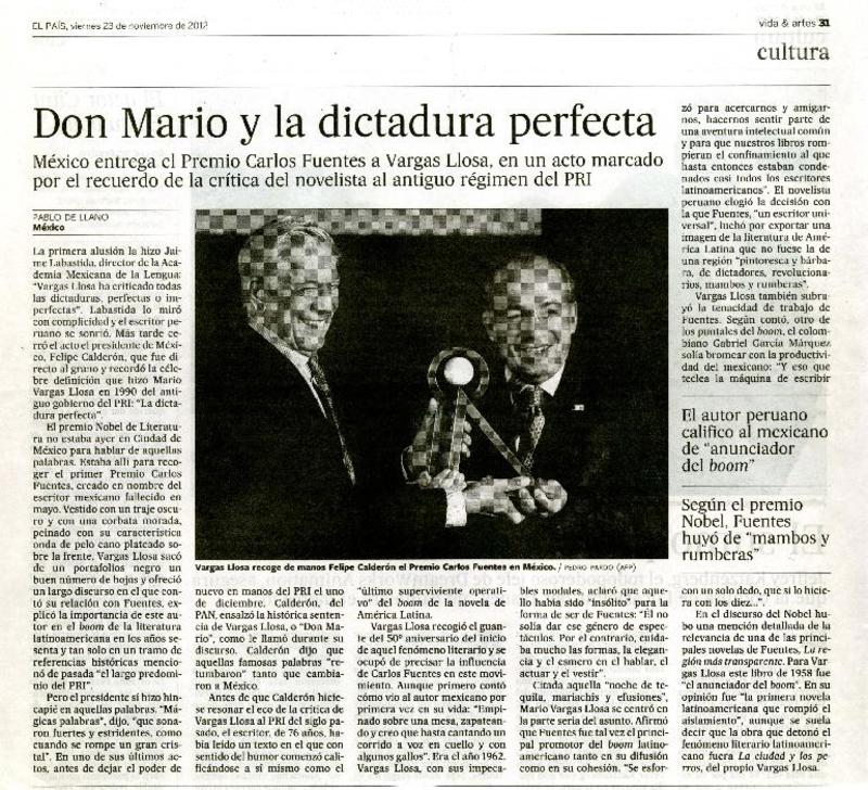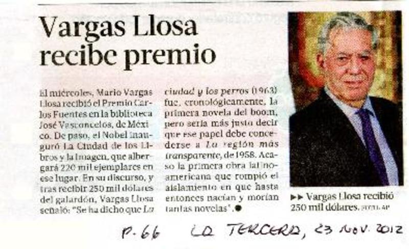 Vargas Llosa recibe premio Carlos Fuentes y destaca legado del autor mexicano [artículo] EFE.