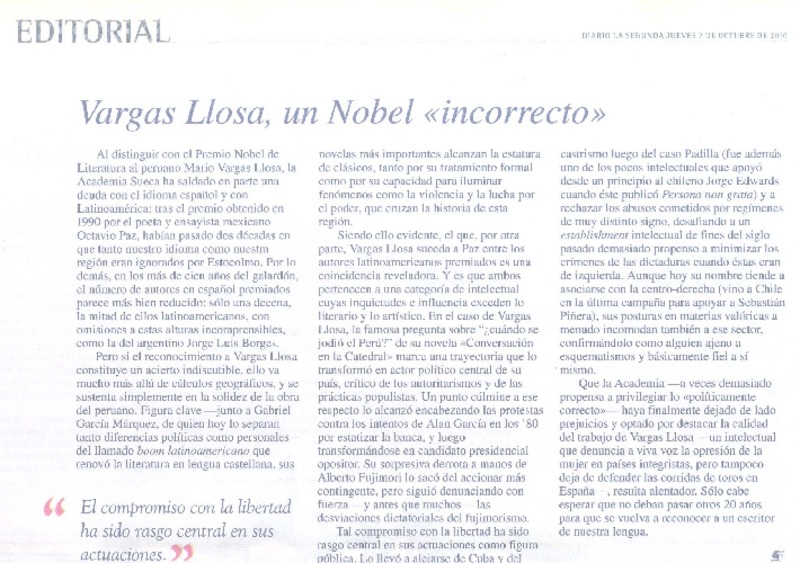 Vargas Llosa, un Nobel "incorrecto" [artículo].