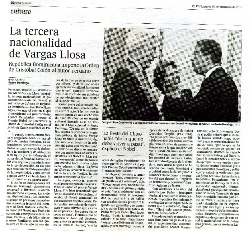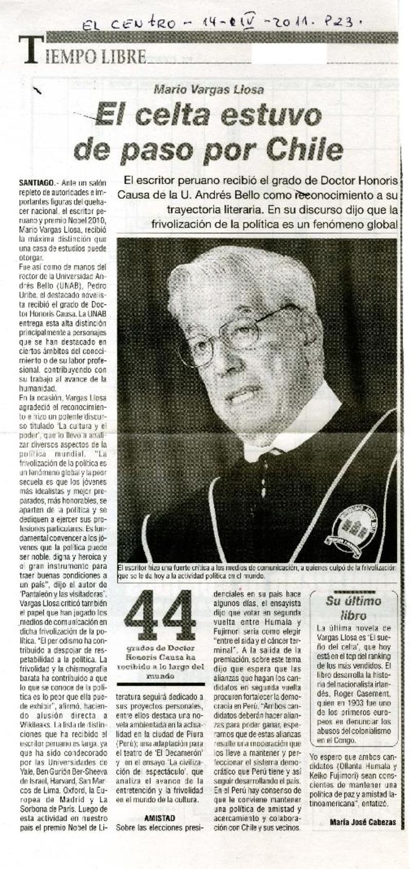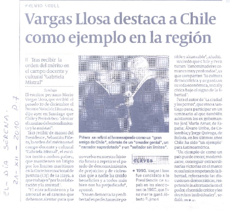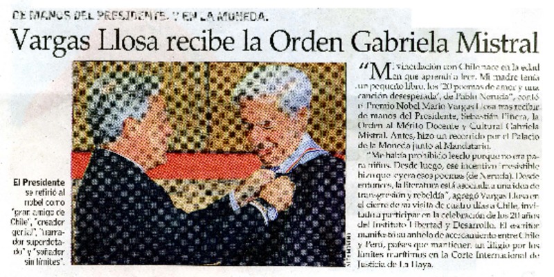 Vargas Llosa recibe la Orden Gabriela Mistral [artículo]
