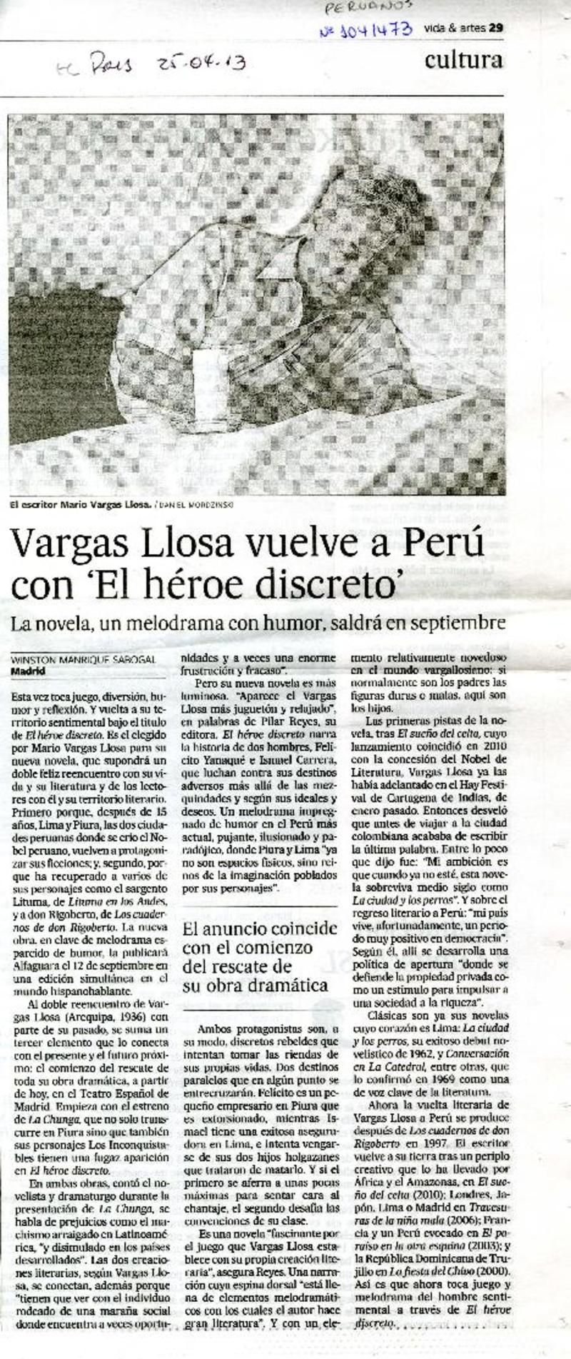 Vargas Llosa vuelve a Perú con "El héroe dicreto" [artículo] Winston Manrique Sabogal.