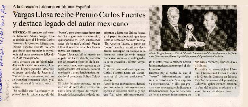 Vargas Llosa recibirá en México el primer premio Carlos Fuentes. [artículo]