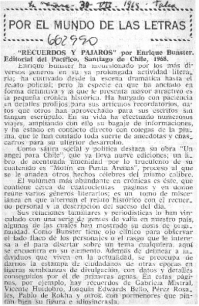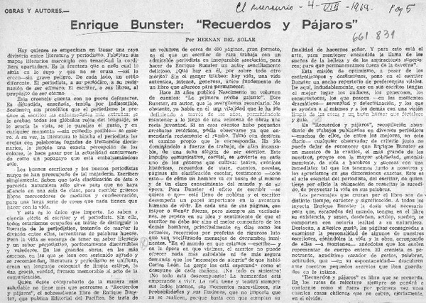 Enrique Bunster: "Recuerdos y pájaros" [artículo] Hernán del Solar.