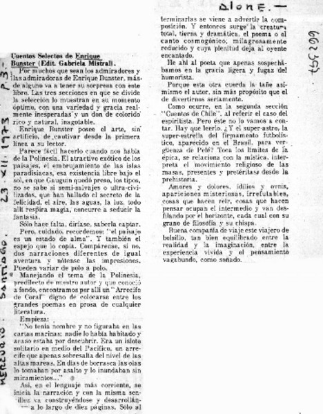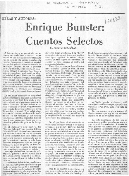 Enrique Bunster, cuentos selectos [artículo] Hernán del Solar.
