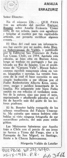 Amalia Errázuriz. [artículo] Margarita Valdés de Letelier.