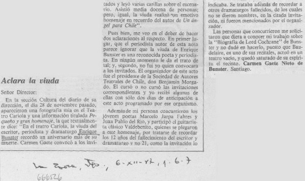 Aclara la viuda [artículo] Carmen Gaete Nieto de Bunster.