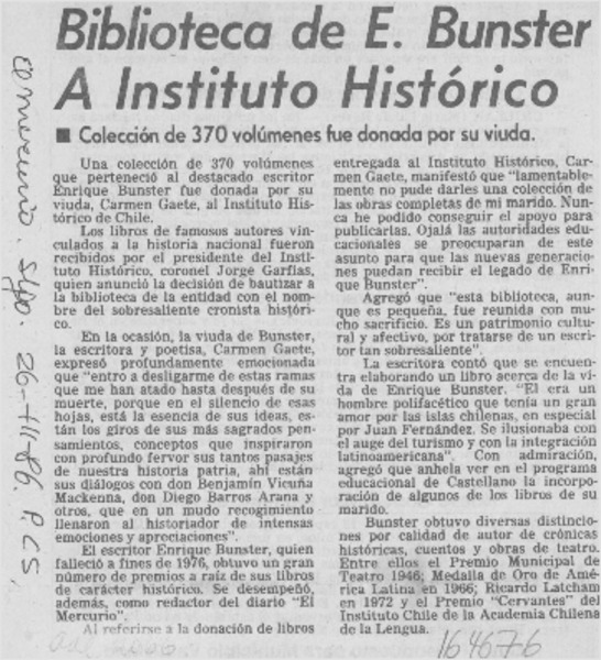 Biblioteca de E. Bunster a Instituto Histórico [artículo].
