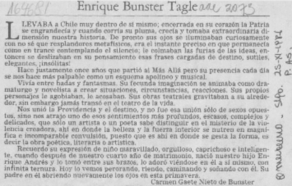 Enrique Bunster Tagle [artículo] Carmen Gaete Nieto de Bunster.