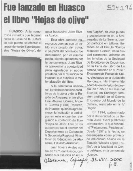 Fue lanzado en Huasco el libro "Hojas de olivo" [artículo]