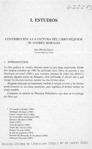 Contribución a la lectura del libro Réquiem de Andrés Morales [artículo] Ana María Cuneo.
