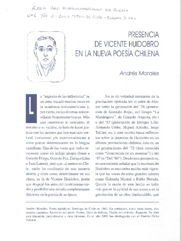 Autores chilenos - Presencia de Vicente Huidobro en la nueva poesía chilena - Huidobro, Vicente - Morales, Andrés