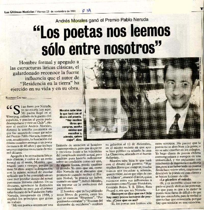 Andrés Morales, Premio Pablo Neruda: "La poesía no se sabe enseñar en los colegios" [artículo] Sergio Tanhnuz