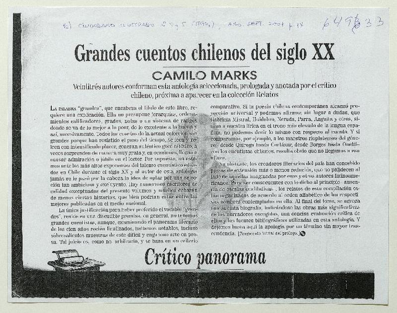 Autores chilenos - Entrevistas - Marks, Camilo - Grandes cuentos chilenos del siglo XX