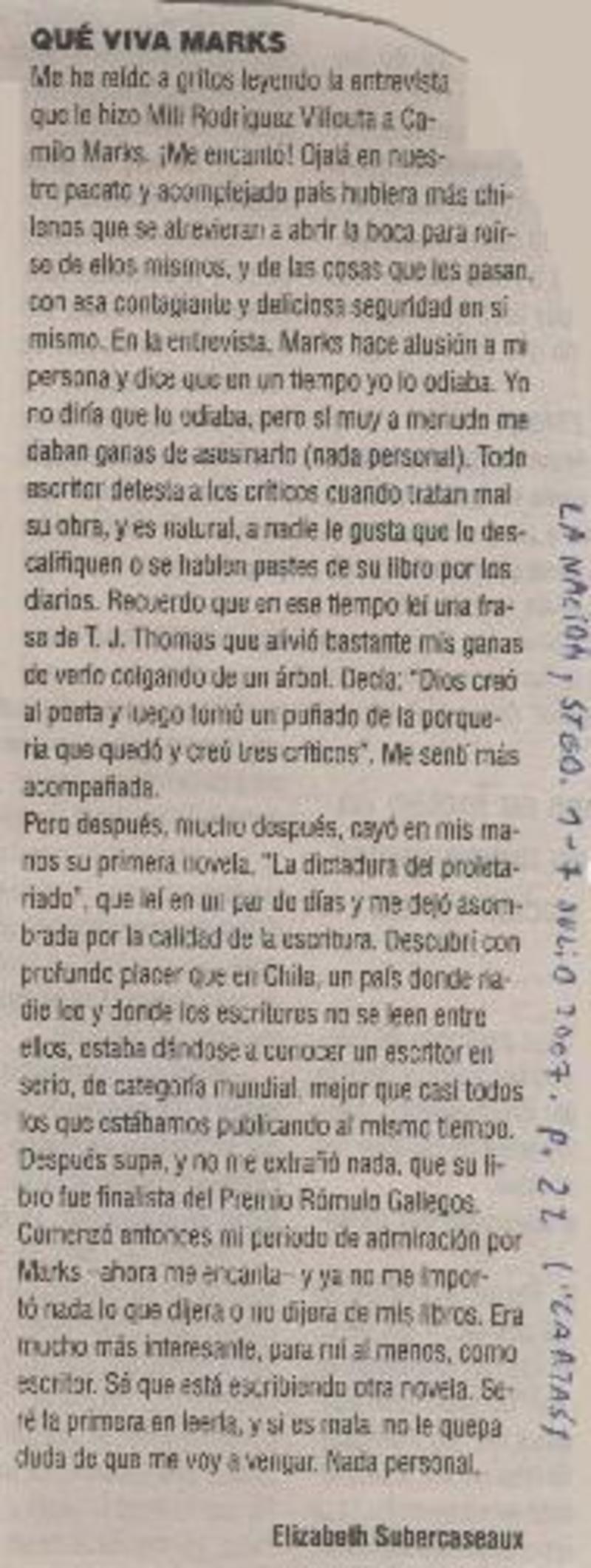 Que viva Marks [artículo] Elizabeth Subercaseaux.