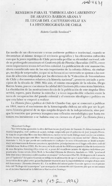Remedios para el "embrollado laberinto" de Arauco, Barros Arana y el lugar del Cautiverio feliz en la historiografía de Chile [artículo] Roberto Castillo Sandoval.