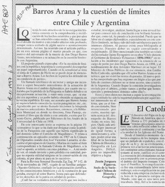 Barros Arana y la cuestión de límites entre Chile y Argentina [artículo] Zenón Jorquera Figueroa.