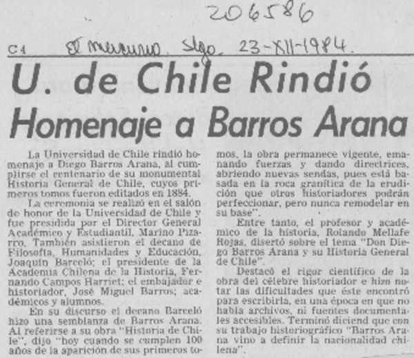 U. de Chile rindió homenaje a Barros Arana [artículo]