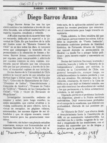 Diego Barros Arana [artículo] Ramiro Ramírez Rodríguez.