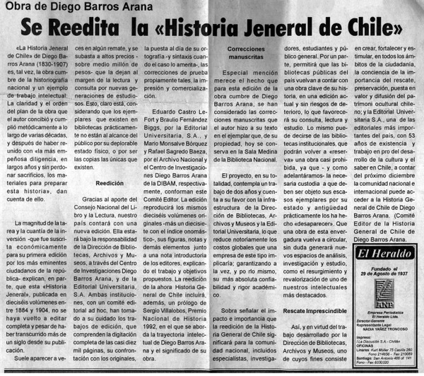 Se reedita la "Historia jeneral de Chile" [artículo]
