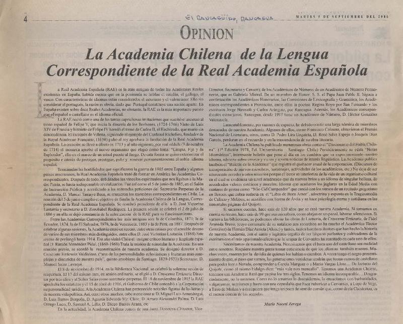 La Academia Chilena de la Lengua Correspondiente de la Real Academia Española [artículo] Mario Noceti Zerega.