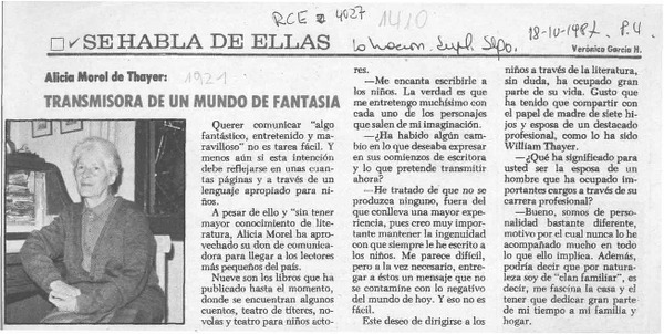 Alicia Morel de Thayer, transmisora de un mundo de fantasía [artículo] Verónica García H.