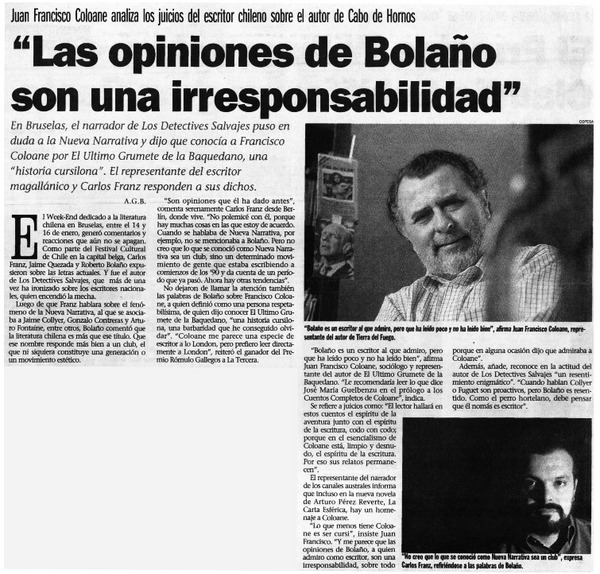 "Las opiniones de Bolaño son una irresponsabilidad" [artículo] A. G. B.
