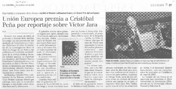 Unión Europea premia a Cristóbal Peña por reportaje sobre Víctor jara [artículo] A. G. B.