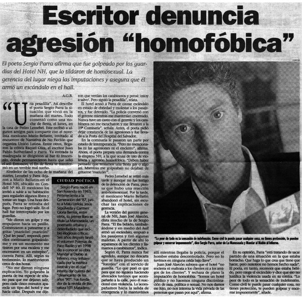 Escritor denuncia agresión "homofóbica" [artículo] A. G. B.