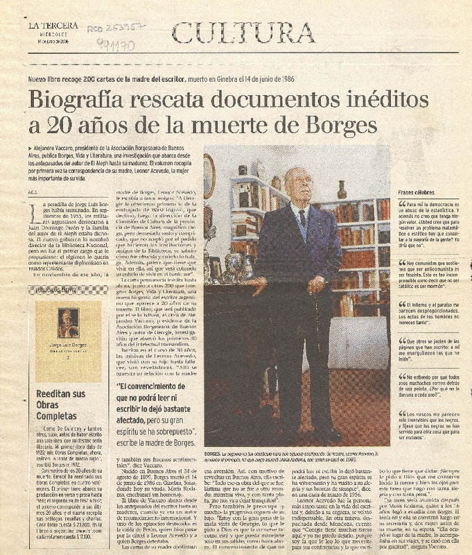 Biografía rescata documentos inéditos a 20 años de la muerte de Borges [artículo] A.G.B.