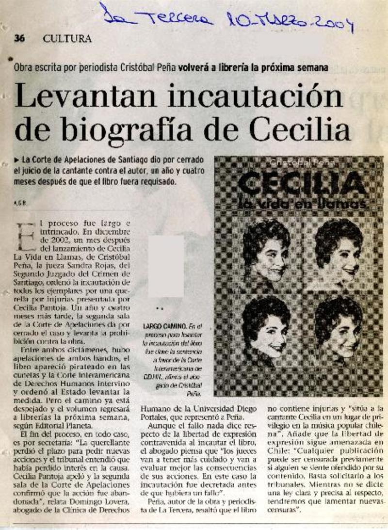 Levantan incautación de biografía de Cecilia [artículo] A.G.B.