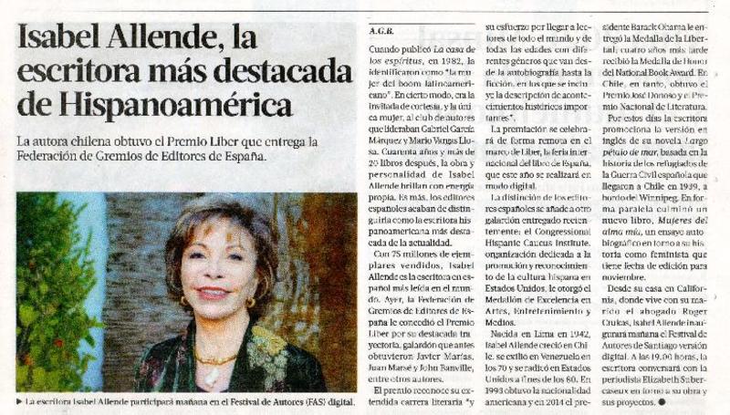 Isabel Allende, la escritora más destacada de Hispanoamérica A.G.B. [artículo]