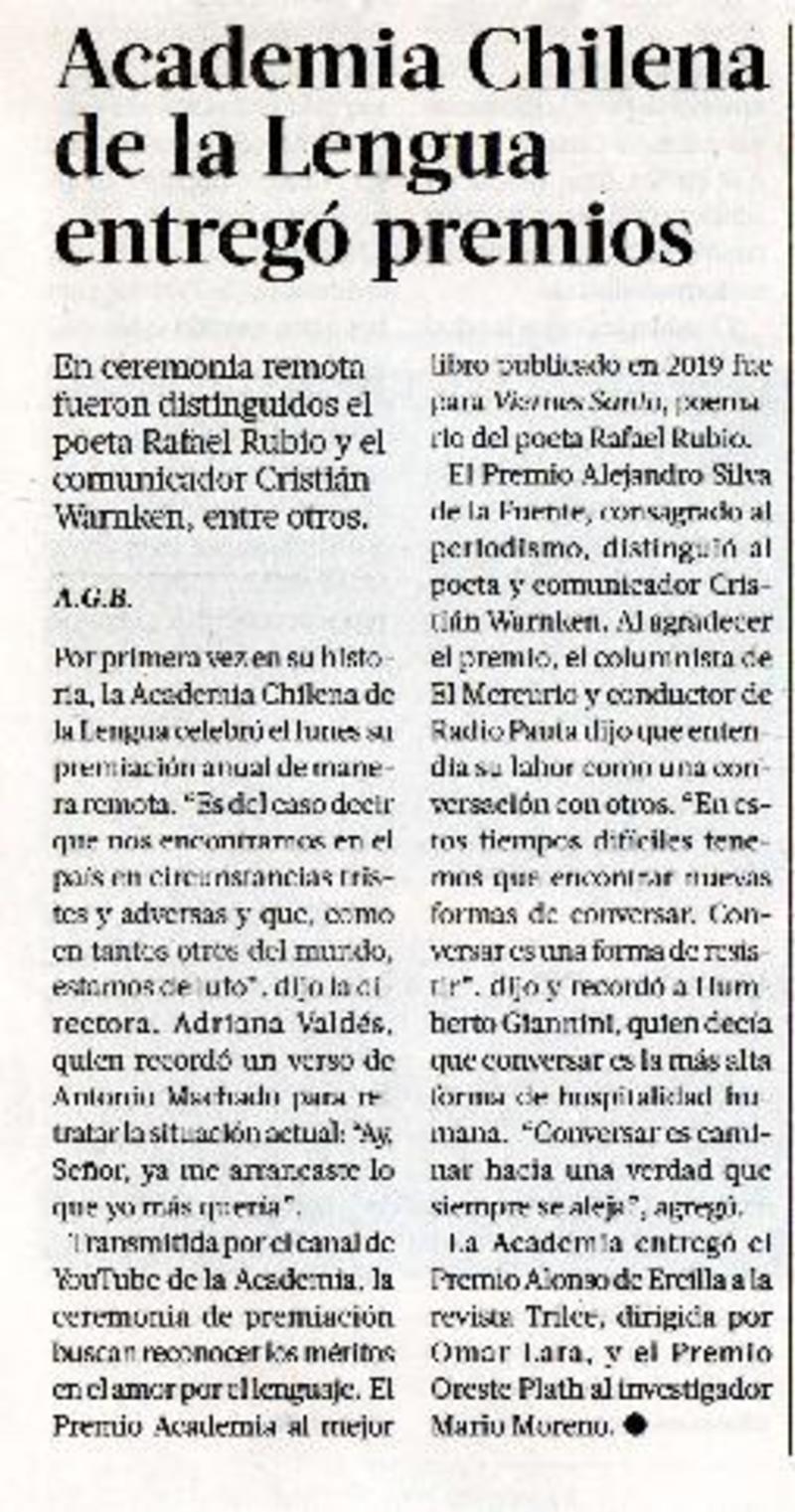 Academia chilena de la Lengua entregó premios [artículo] A.G.B.