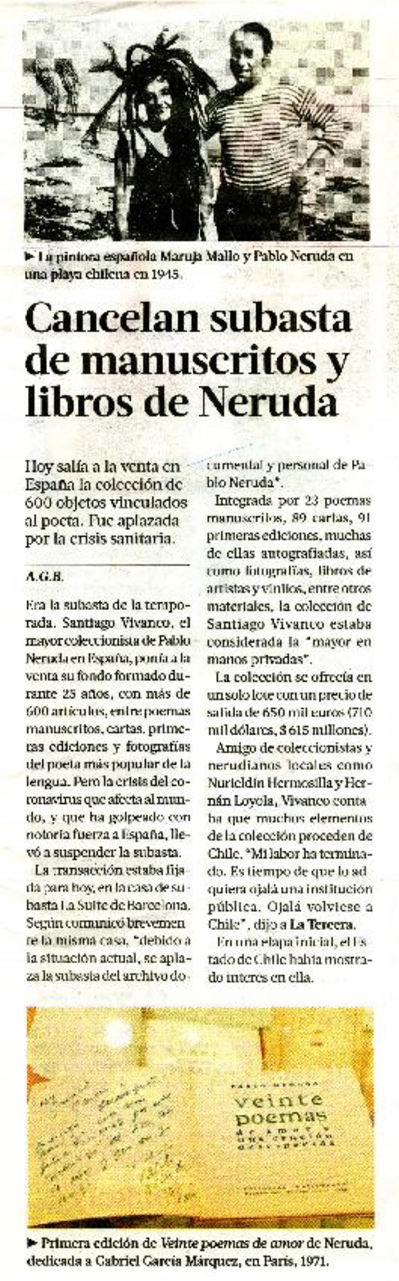 Cancelan subasta de manuscritos y libros de Neruda [artículo] A.G.B.