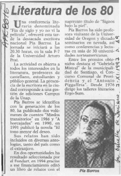 Pía Barros, mujer de puño y letra [artículo] Otilia Huerta Pasten.