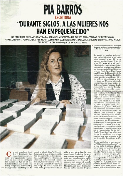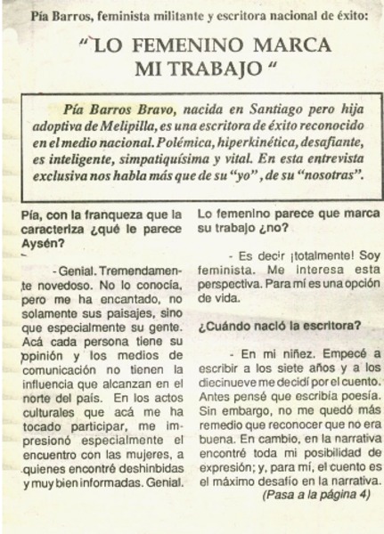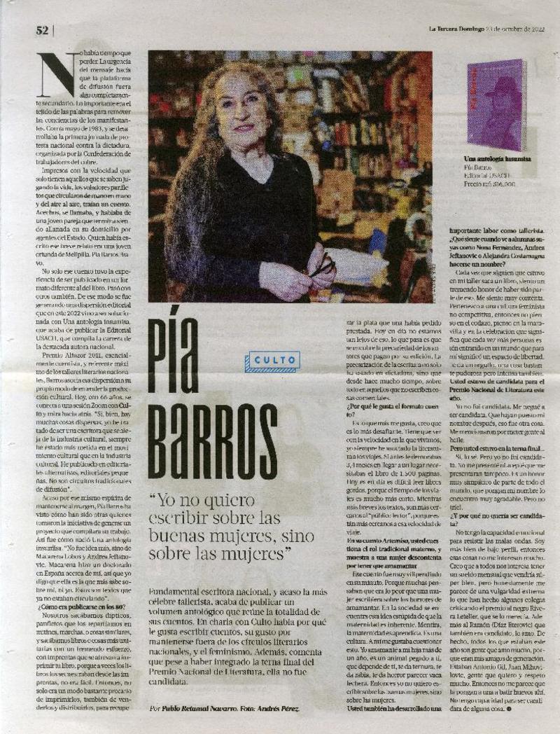 Pía Barros, "yo no quiero escribir sobre las buenas mujeres, sino sobre las mujeres" [entrevista] [artículo] : Pablo Retamal Navarro.