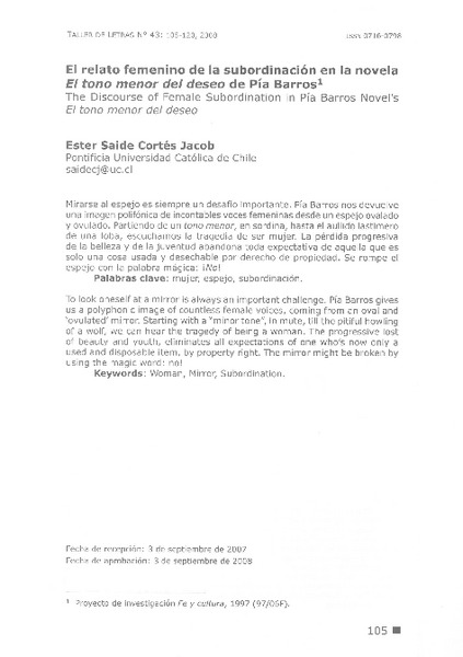 El relato femenino de la subordinación en la novela El tono menor del deseo de Pía Barros [artículo] Ester Saide Cortés Jacob.