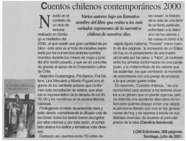 Cuentos chilenos contemporáneos 2000 [artículo] Carolina Sandoval.