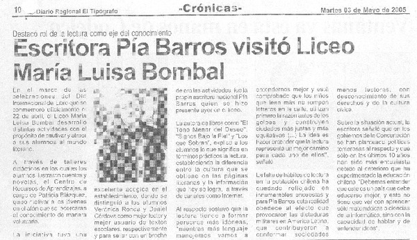 Escritores Pía Barros visitó Liceo María Luisa Bombal. [artículo]
